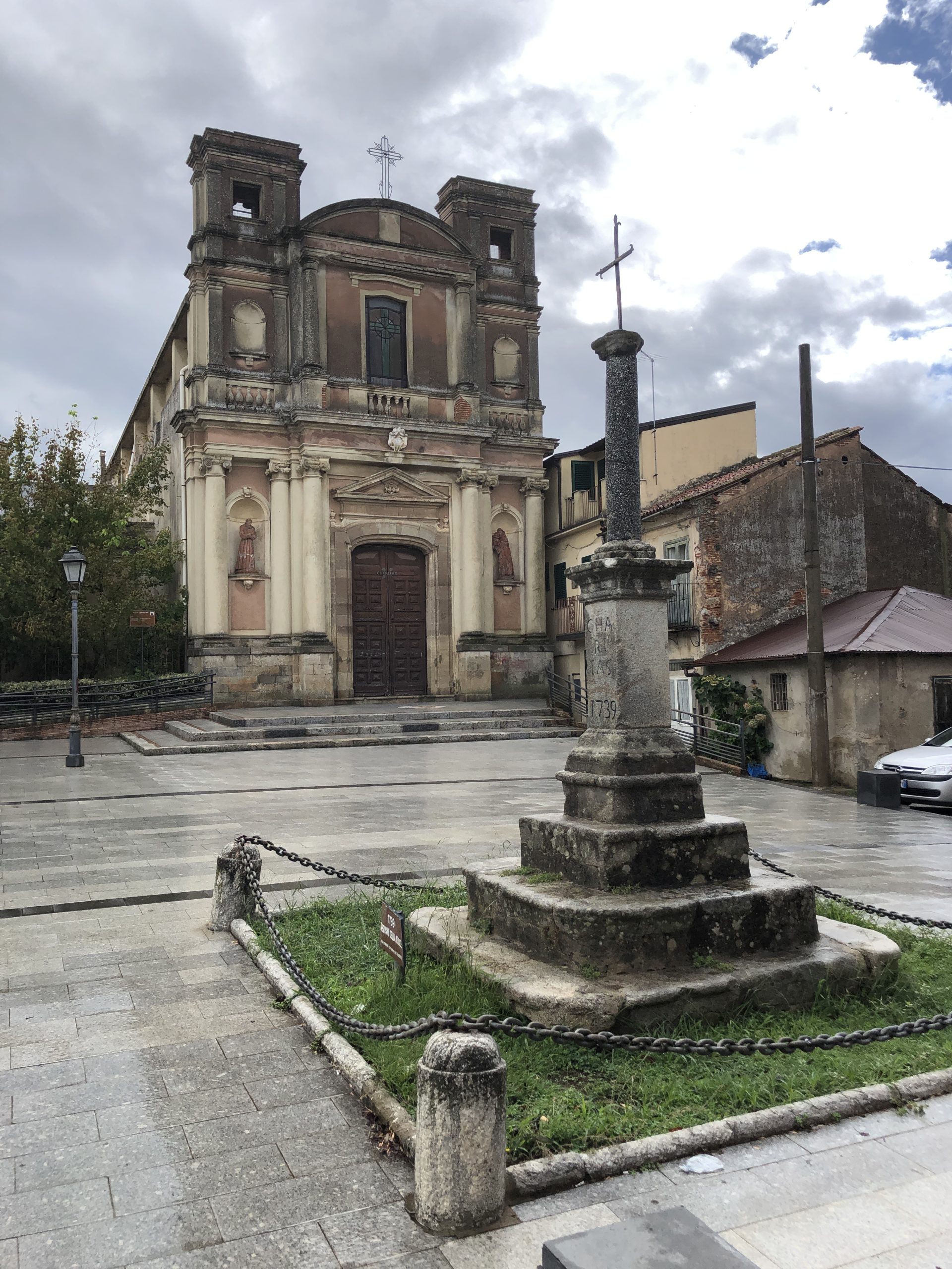 Van Linguaglossa richting Castiglione dir Sicilia vervolgens de SS 186 richting kust. Maar de SS186 is op 5 juni afgesloten, zal dat in september nog zo zijn? Dus de SS120 naar Randazzo. Dit plaatsje ligt aan de noordoostelijke flank van de Etna, bijgenaamd Citta Nera (De zwarte stad). De hele stad is gebouwd met donkere lavasteen, straten, gevels, muren zitbanken etc. Na Randozza nemen wij de SS116 naar de kust en dan de SS 113. Uiteindelijk een stuk A2 naar Messina. Daar nemen we de boot naar Villa S. Giovanni. Op het vasteland gaan we verder via Laganadi, Santo Stefano in Apspromonte en komen uit in Gambarie, dat ligt op een hoogte van 1450 meter en is in de winter een skigebied. Het laatste stuk rijden we over de SS 183 naar Polistena in Calabrië. De kerk aan de overkant van het hotel is een bezoekje waard. Maar tijdens de rustdag kan je in dit plaatsje heerlijk rondstruinen.