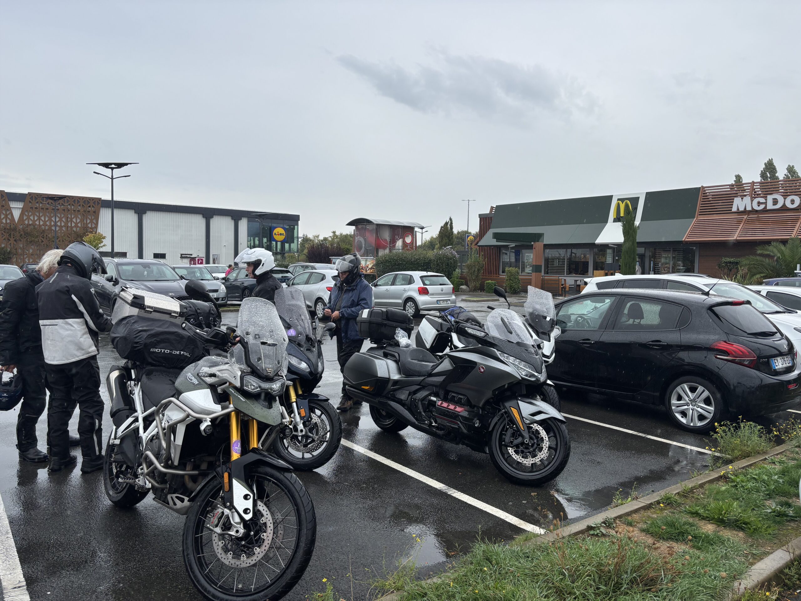 Vanaf de start in Bourges tot aan nu helaas bijna continue regen. Regenpak lekt, dus een natte broek en kippenvel. Hopelijk klaart het nog op. Onderweg nog bijna een aanvaring…