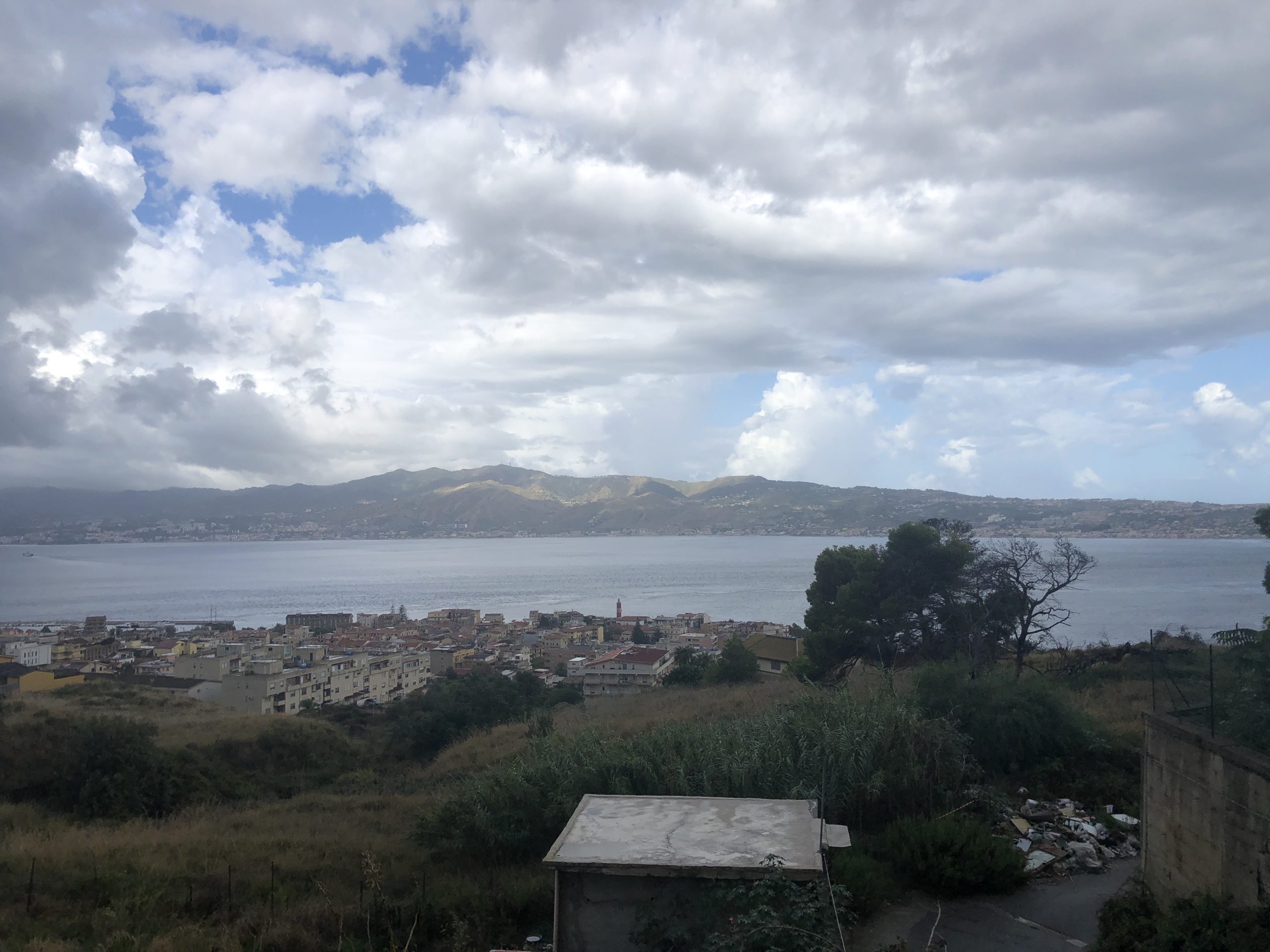 Vanaf het vasteland van Italie, dicht bij de plek waar de ferry aan- en afmeert, heb je mooi zicht op Sicilie. We zijn bijna op het punt waar we de overtocht gaan maken. De ferry brengt ons van San Giovanni naar Messina.