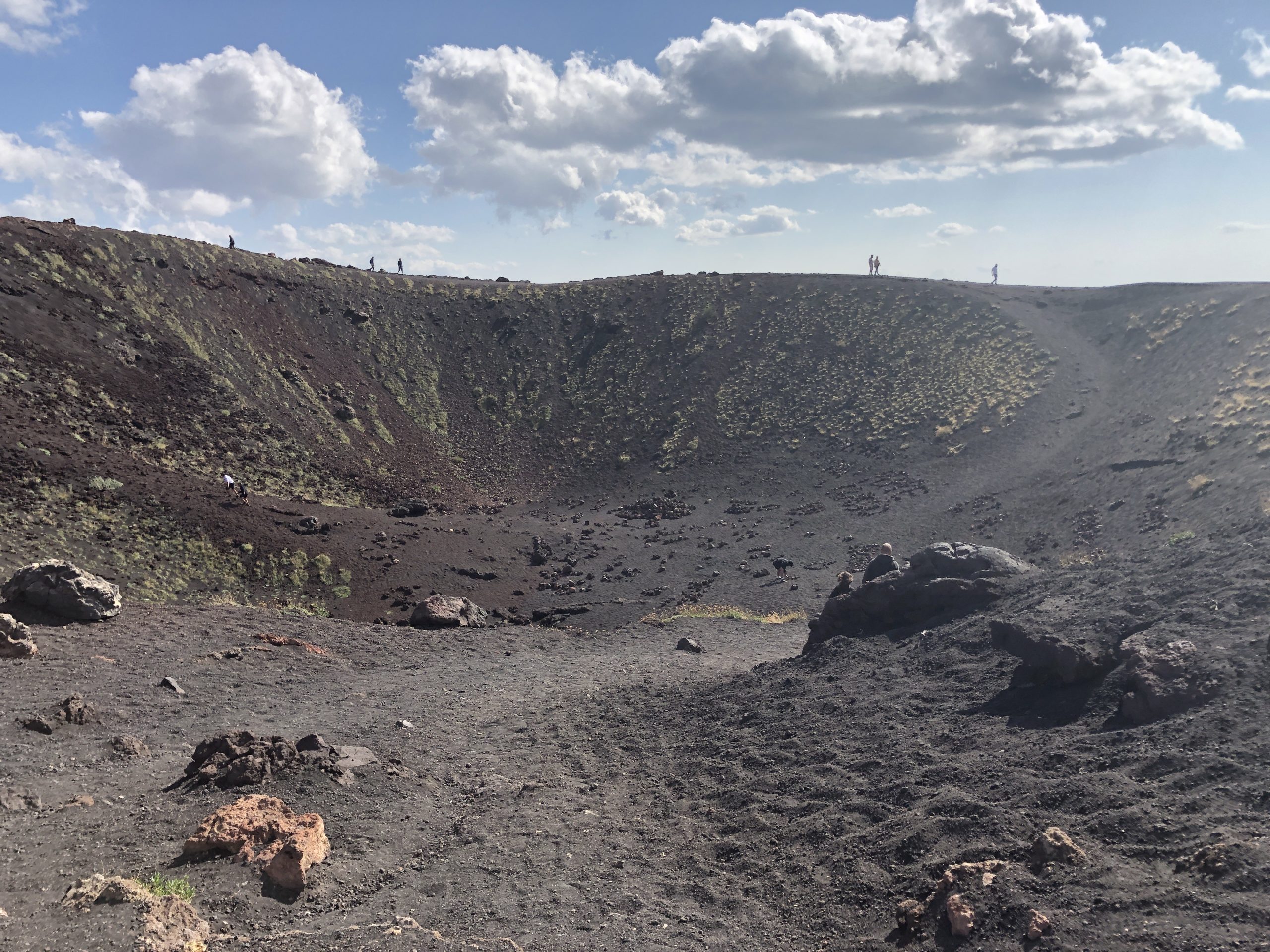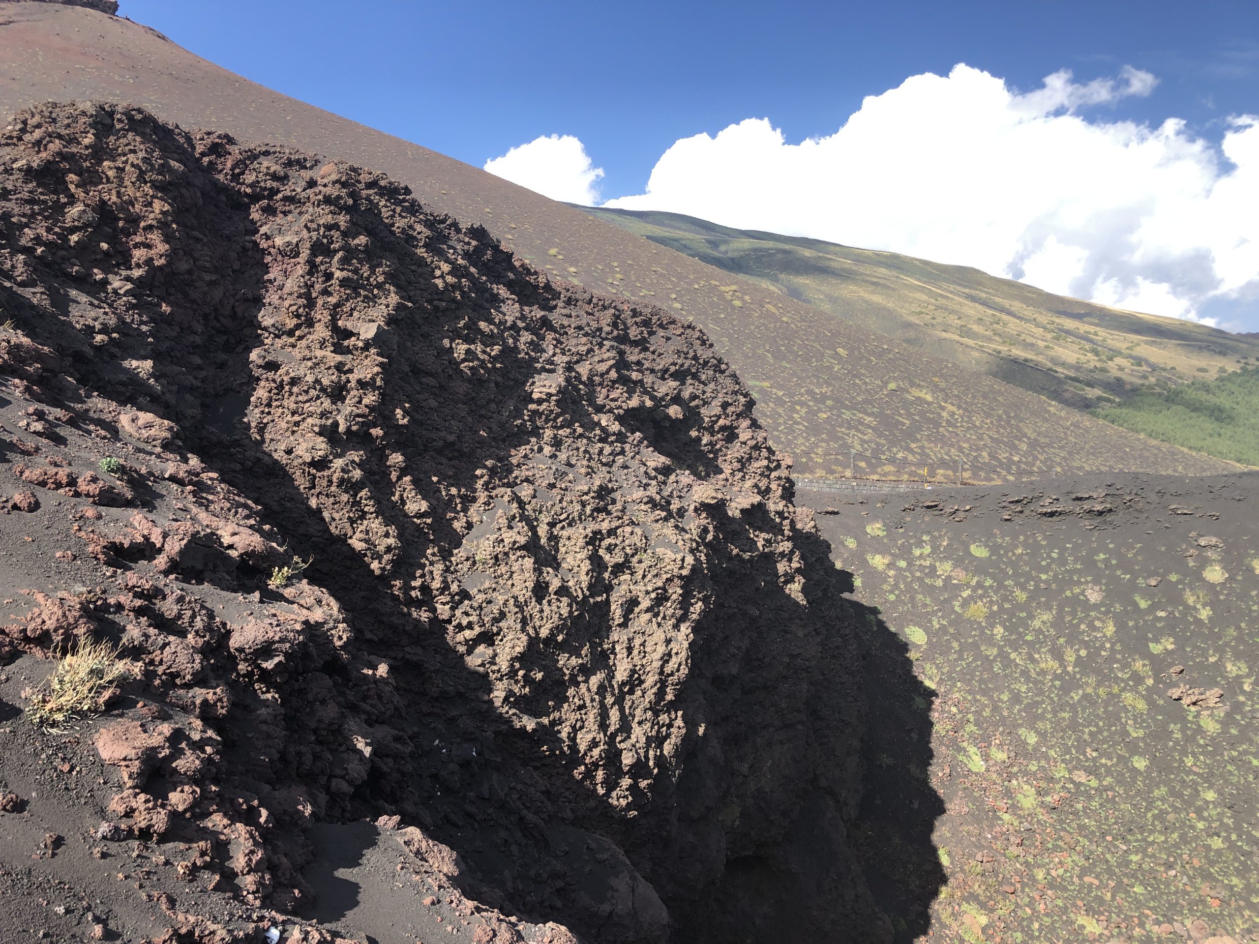 De route leidt langs de Etna vulkaan dus een mooi gelegenheid om even een kijkje te nemen. Het is een ruig gezicht, enorme kraters en werkelijk overal lava en lavastof. Er zijn een aantal kraters maar niet alles is toegankelijk.