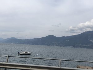 Op weg naar Molveno in de Dolomieten rijden we een lang traject langs de oostkant van het Gardameer. Het is weekend, prachtig weer en derhalve erg druk aan het water. Een rustige plek voor een korte lunch is moeilijk te vinden. Net voordat we het Gardameer verlaten vinden we een leuk eettentje met mooi uitzicht.