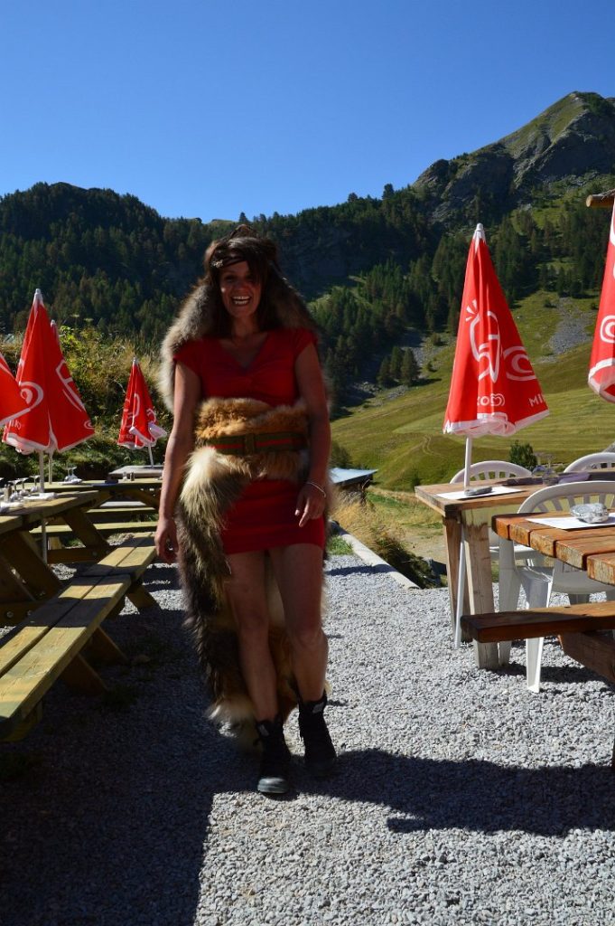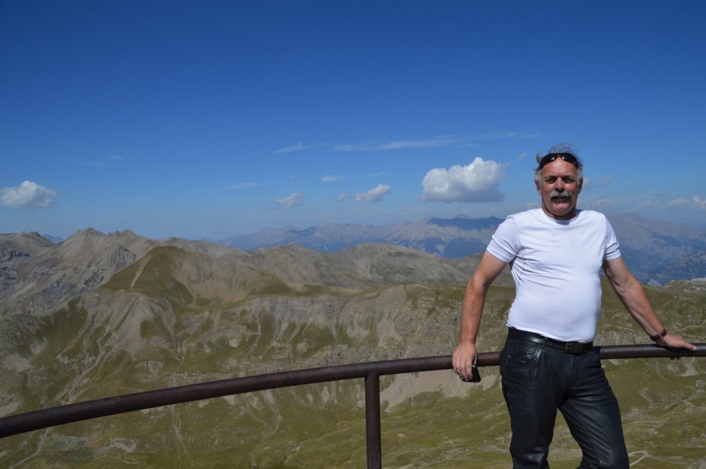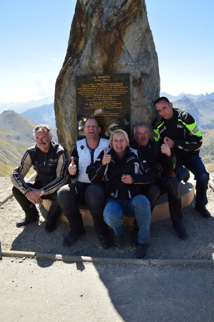 Soms heb je van die dagen met bijzondere ontmoetingen. Vandaag was er zo een. Na een mooie aanrijroute beklimmen we de Col de Vars. Mooie ruime wegen en vloeiende bochten. Eindelijk een haarspeldvrije (nieuwe term voor in de Dikke Vandale) col waar je lekker slingerend naar boven gaat. Na deze col staat de Col du Bonnette in het schema. Onderweg hierheen stoppen we voor een foto en even wat drinken. Zonder er in eerste instantie erg in te hebben staan we vlak bij een klein eettentje, waar we boven op het dak keken. Reisgenoot Jaap loopt naar beneden om een colaatje te scoren en komt lijkbleek terug. Het eettentje blijkt in werkelijkheid een wolvenhol. Drie dames verkleed als wolf staan achter de bar en bedienen de klanten als een echte wolf met de daarbij behorende geluiden. Een klant bestelde gebak met slagroom, wat de wolvinnen vervolgens met de slagroom deden zal ik maar niet verder uitdiepen. Een onvergetelijke ontmoeting. De beklimming van de Col dus Bonnette is prachtig, er komt geen einde aan de bochten op weg naar de top. Soms denk je, ik ben er bijna, maar dan volgt weer een hele serie kort op elkaar volgende bochten. Aan de top gekomen (boven de 2800 meter) is het een drukte van jewelste. De motor kan met moeite worden geparkeerd, maar wat een fantastisch uitzicht. Te voet zijn we nog de Cime de la Bonnette opgeklommen, een wandeling van een klein kwartier. Van hieruit heb je fantastisch uitzicht over de hoge Alpen toppen en kijk je mooi uit over de pas. Uiteraard even op foto vastgelegd. De afdaling is ook geweldig, uitdagend door de vele bochten met soms geweldig en soms slecht asfalt. Onderaan de col gestopt voor de middagmaaltijd. Heerlijke lunch….ja, met friet. Tijd om door te rijden naar weer de volgende uitdaging, col de Couillole. Deze stond weliswaar niet in het schema vermeld maar een onvergetelijke col met smalle weggetjes, hoekige bochten langs een paarsrood gekleurde rotswand. Na de afdaling tijd voor een glaasje fris en daarna de Col de Cayolle.