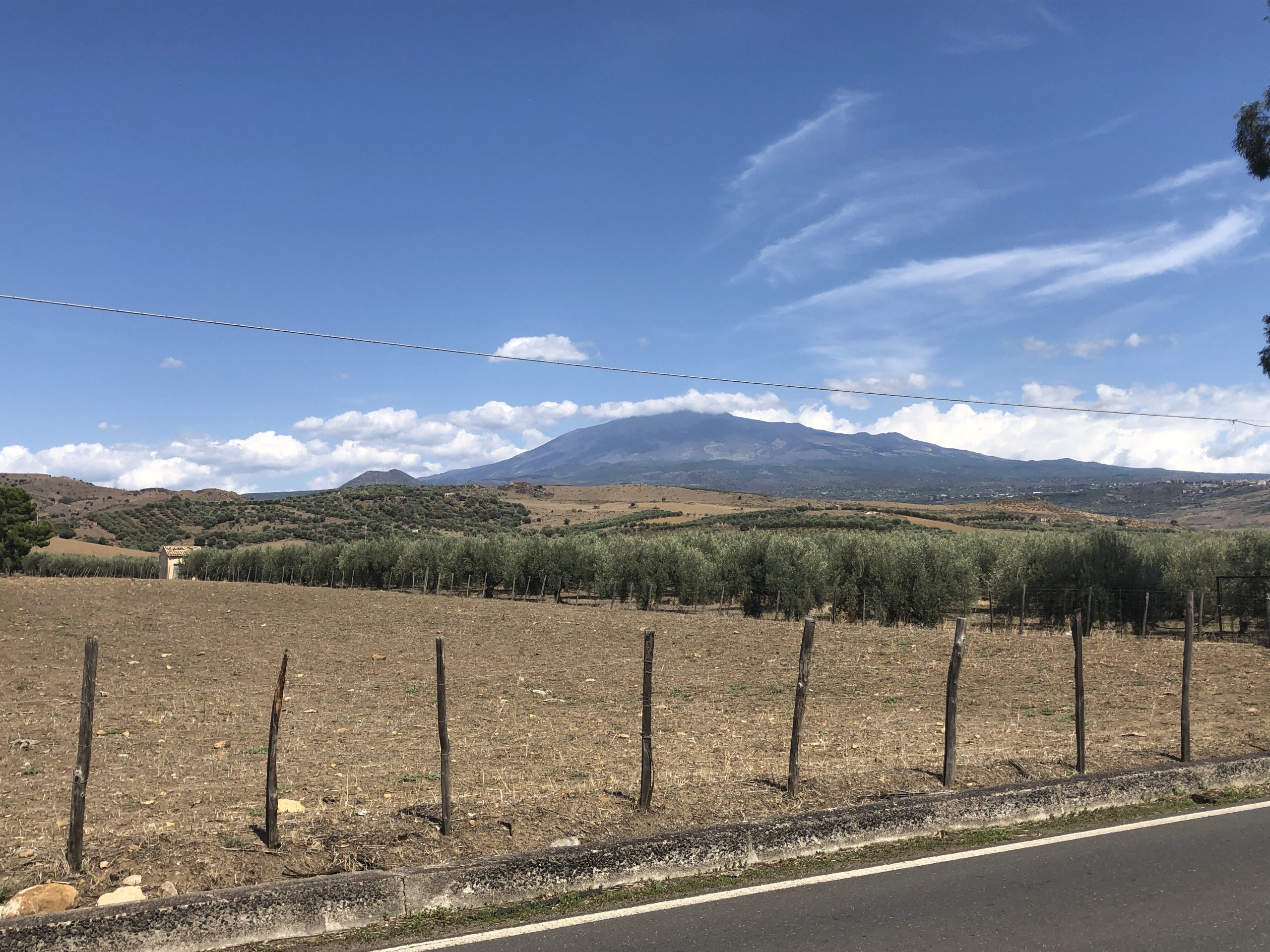 Onderweg naar de Etna proberen we alvast een plaatje te schieten van de vulkaan. Indrukwekkende verschijning in het relatief vlakke landschap.