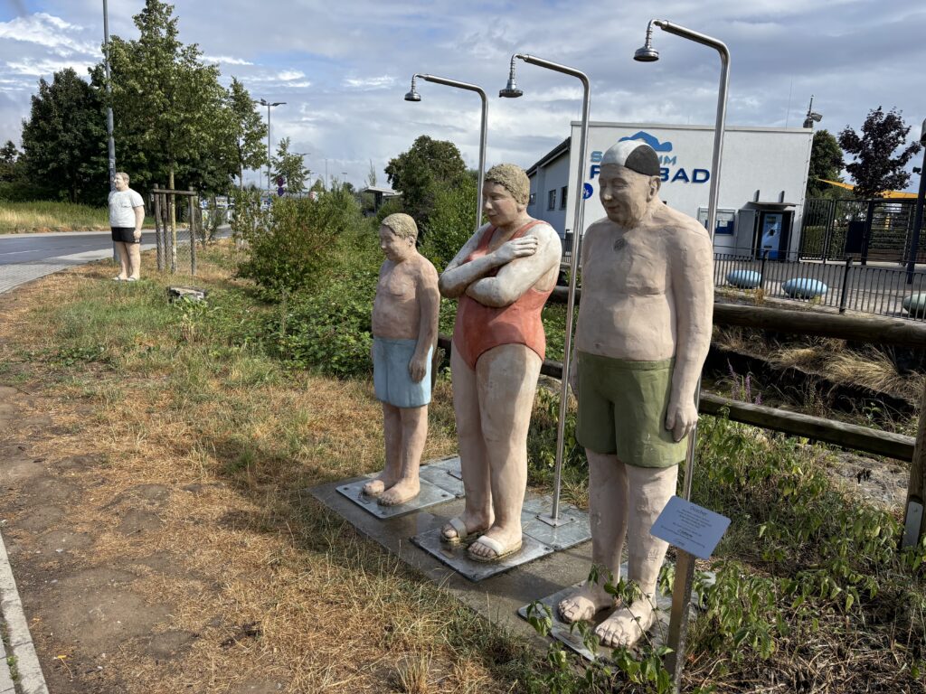 Vanaf de camperplaats lopen we een stukje met de hond. Wepasseren een zwembad en een klein parkje waar diverse kunstwerken staan tentoongesteld. Leuk voor een foto.