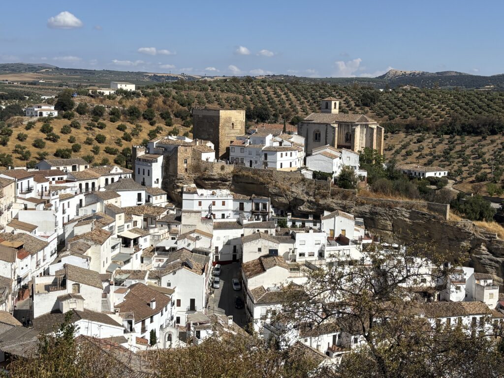 We doorkruisen het plaatsje Setenil. In typisch Andalusische stijl zijn alle huizen wit geschilderd. Met de zon er op levert dit prachtige beelden op.