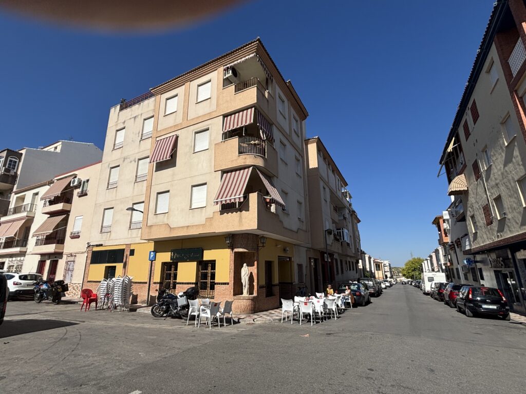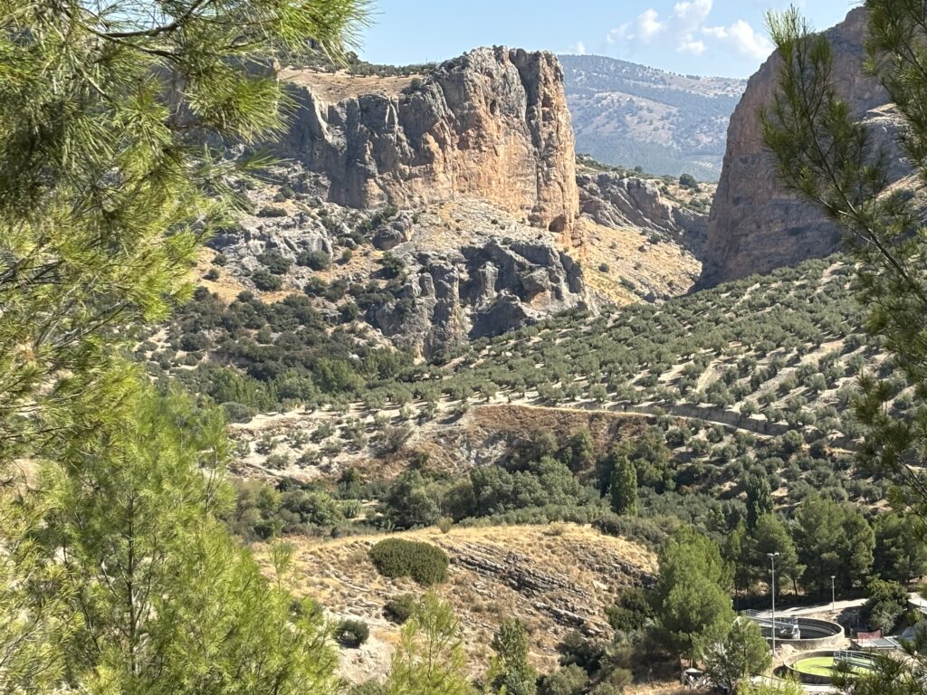 Even koffiepauze. We stoppen in Torre del Campo. Het is 23 graden en strak blauwe lucht. Eindeloze boomgaarden met olijven, we zwieren en zwaaien er doorheen.