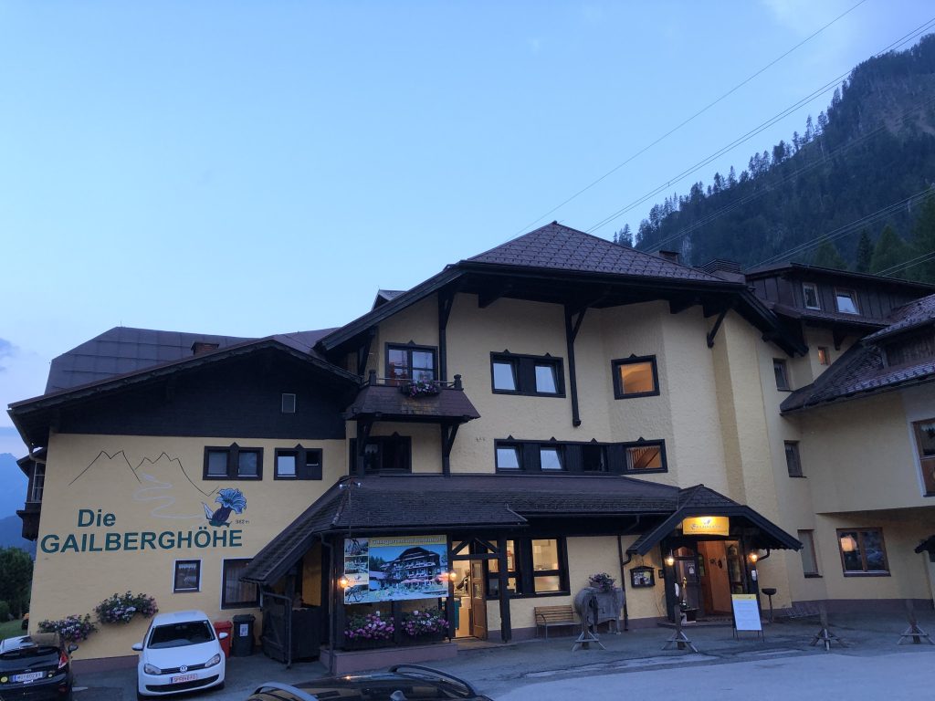 Hotel Gailberghöhe in Kortschach-Mauthen. Ons hotel voor de komende dagen. Grote garage voor de motoren, goed eten en ‘s-avonds een lekker biertje bij terugkomst van de dagtochten. Tegenover het hotel ligt een mooie camperplaats.